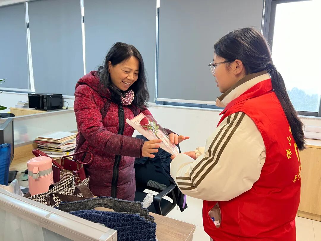 与此同时,“流动祝福” 行动在学校实训楼、有为楼等教学场室同步展开。学生志愿者们化身 “幸福信使”,手捧手写贺卡和鲜花,穿梭在校园的各个角落,将祝福及时送到女教职工手中。这份跨越空间的关怀,让女教职工们在忙碌的工作中感受到了别样的温暖。