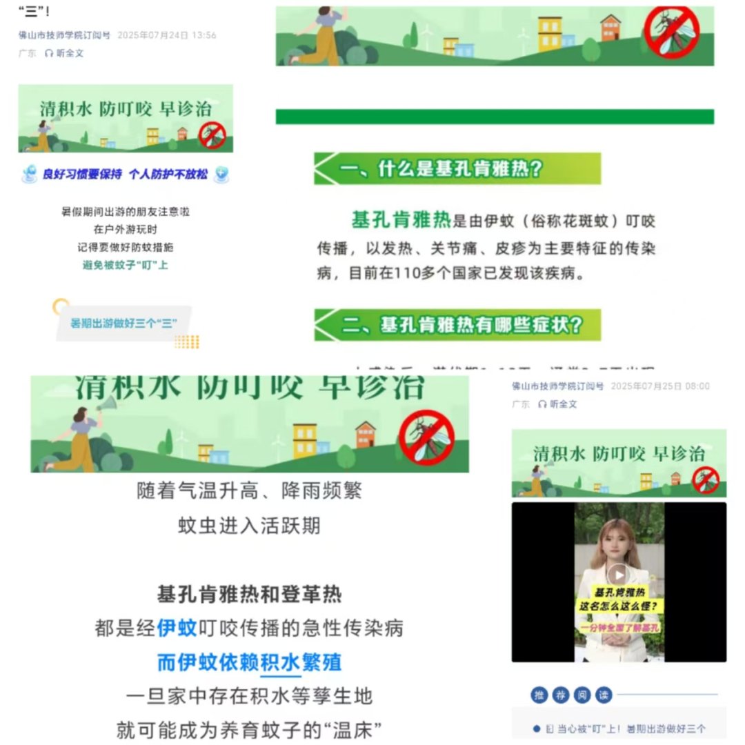 学校通过多种渠道加强宣传教育。在班级群、企业微信、公众号发布基孔肯雅热预防相关文章,广泛宣传应对措施,累计阅读量达七千多人次。