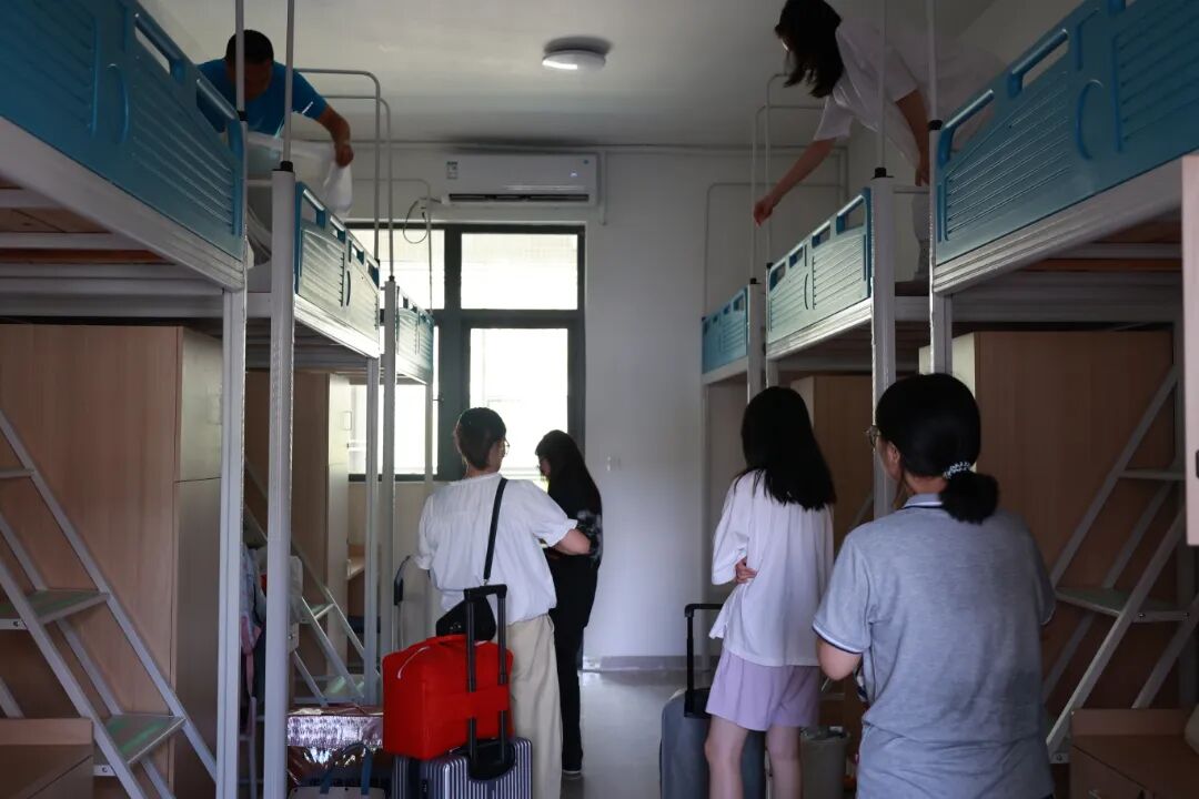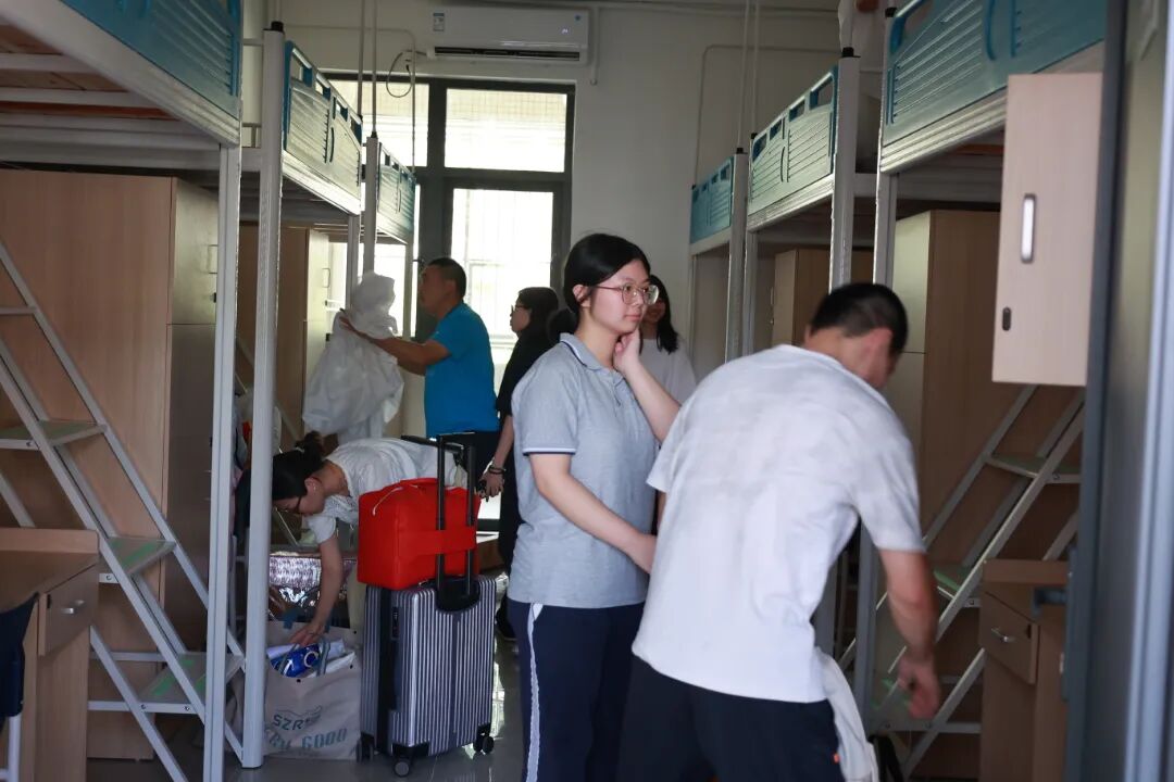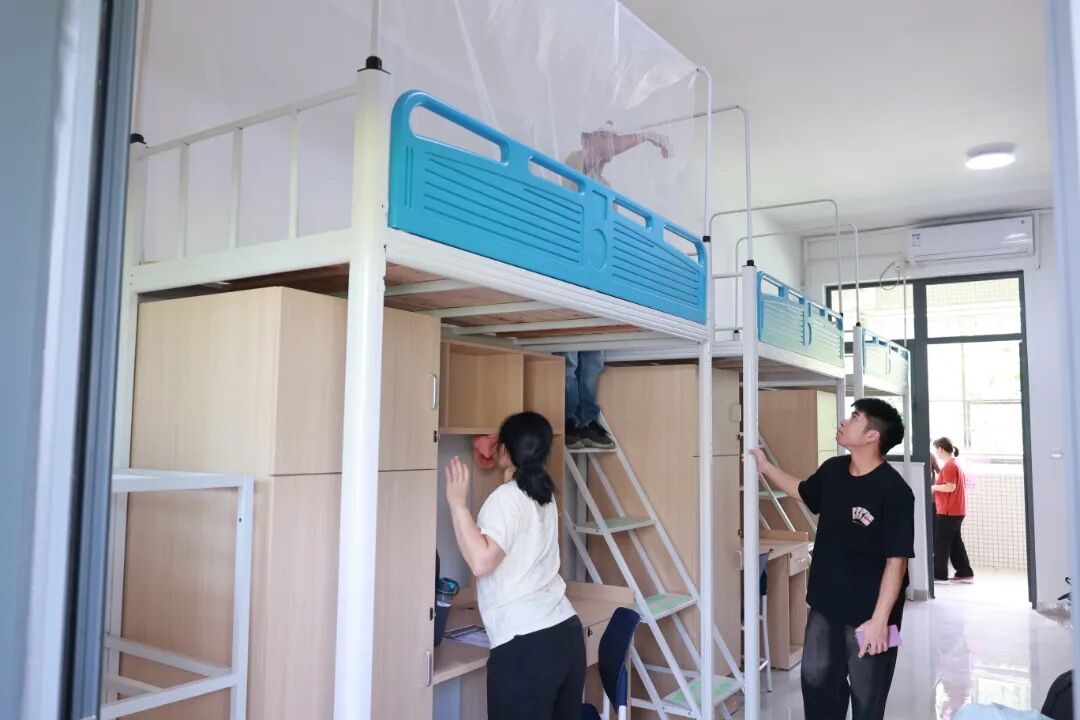 走进宿舍,家长们更是忙个不停:铺床单、蚊帐,仔细擦拭书桌、衣柜,整理行李······“以后凡事要自己多操心了。” 家长们的话语里带着不舍,却也藏着期待——这一趟忙碌的护航,是孩子开启新征程的细致陪伴,让孩子更好地迎接独立学习生活的全新旅程。