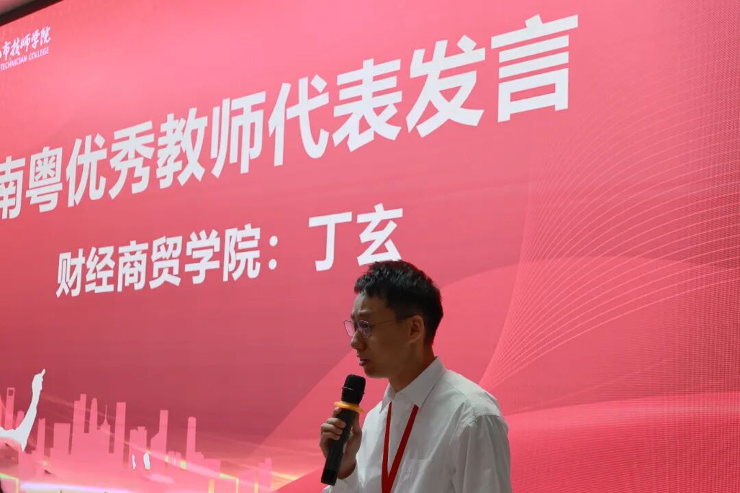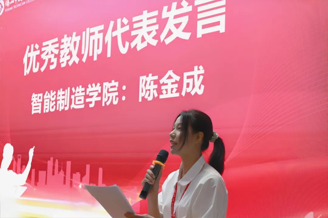 教师代表发言环节,南粤优秀教师代表丁玄、优秀教师代表陈金成、新入职教师代表高瑾先后上台。他们结合自身教学经历与职业感悟,分享了在技能人才培养中的实践经验与成长收获,传递出对技工教育事业的热爱与坚守,展现了新时代教师的责任与担当。