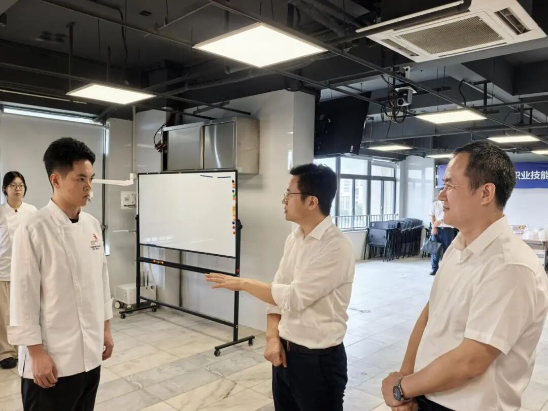 市局领导一行深入烹饪(西餐)项目选手集训场地,实地察看集训环境、设施配置及备战进展情况,听取教练关于竞赛评分标准、技术要点的汇报,与选手深入交流,详细了解赛项训练进度及选手培养计划,对学校备赛工作给予肯定,并提出明确要求:一要精准对标国赛标准,聚焦竞赛重点难点强化实战化训练;二要做好服务保障,为选手备赛创造良好条件;三要加强心理调适,保持积极的心态,确保在比赛中能够发挥出最佳水平。同时,鼓励师生团队科学训练、精益求精,全力推进冲刺集训各项任务,以精湛技艺在国赛中争取优异成绩。