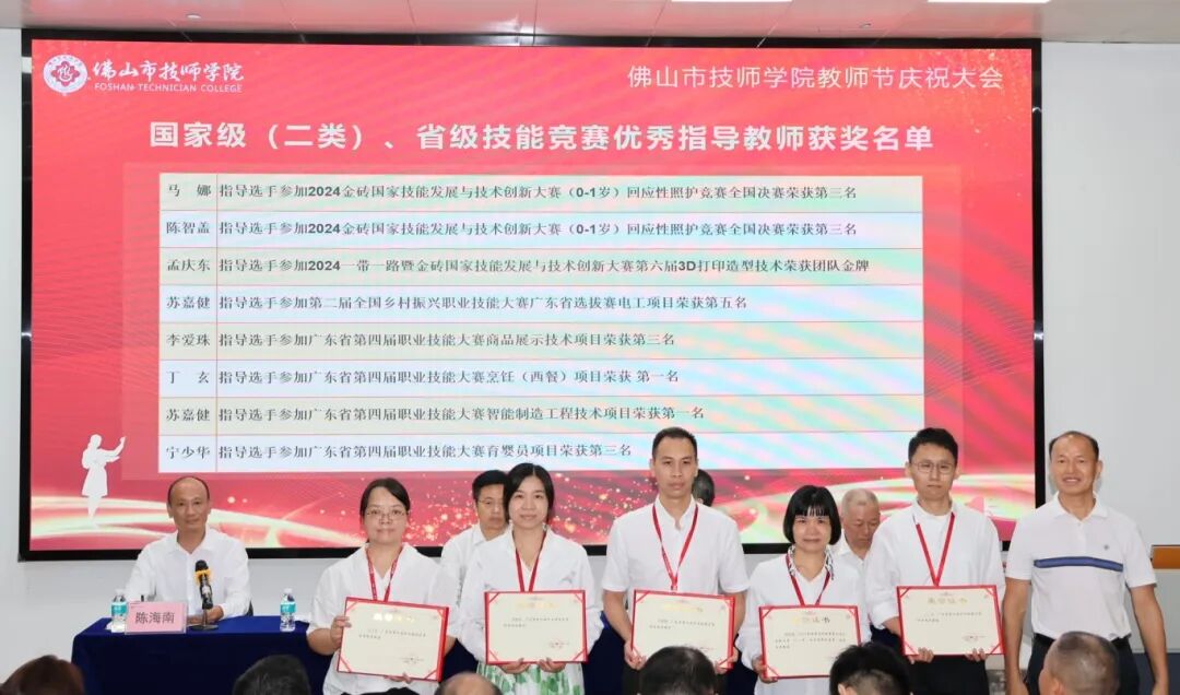 上午10时,佛山市技师学院教师节庆祝大会在教学附楼阶梯报告厅主会场与实训教学楼A205视频会场同步举行。市人力资源社会保障局苏岩局长、陈再勋副局长、张有志三级调研员等领导,以及学校全体教职工共同参会,大会由学校党委副书记陈海南同志主持。