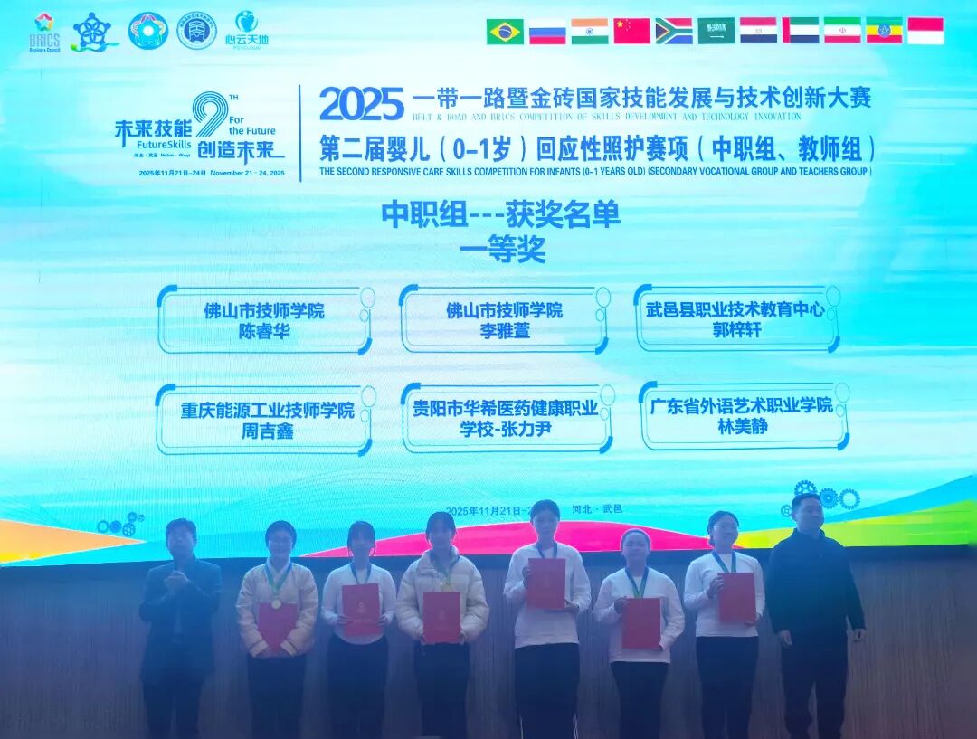 近日,2025年“一带一路”暨金砖国家技能发展与技术创新大赛第二届婴儿(0-1岁)回应性照护赛项全国总决赛在河北武邑圆满落幕。我校师生参赛团队在全国30余个省(市)的141支队伍(61支中职组、80支教师组)中奋勇争先,最终以2金1银的优异成绩脱颖而出,同时,学校荣获“最佳组织奖”与“优秀组织奖”,充分彰显了我校在婴幼儿照护专业领域的教学实力。