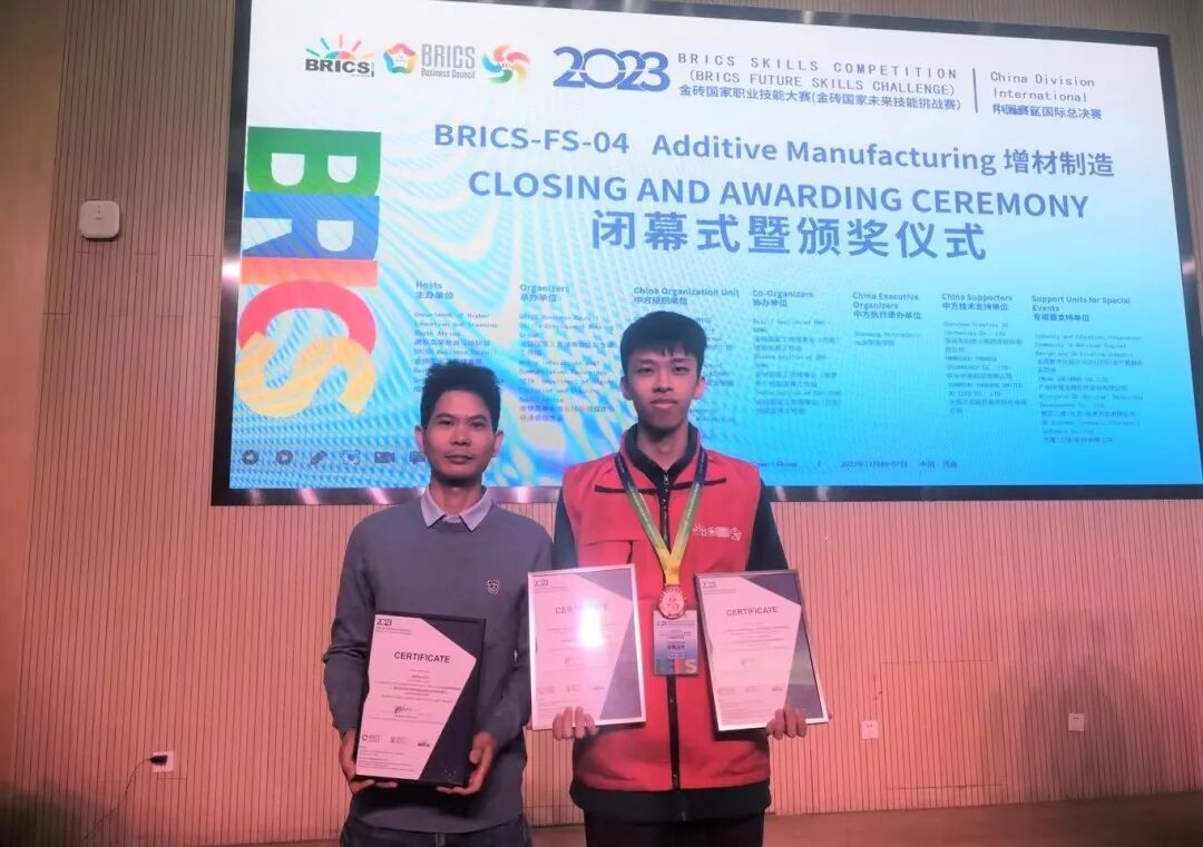 参赛选手来自巴西、俄罗斯、印度、中国、南非五个金砖国家共50余名。比赛中,莫沛豪同学发扬积极进取、勇往直前的竞赛精神,沉稳应战。经过两天的激烈角逐,莫沛豪同学凭借过硬的心理素质和专业知识技能,最终荣获国际总决赛铜牌,展现出了我校学子良好的技能风采!
