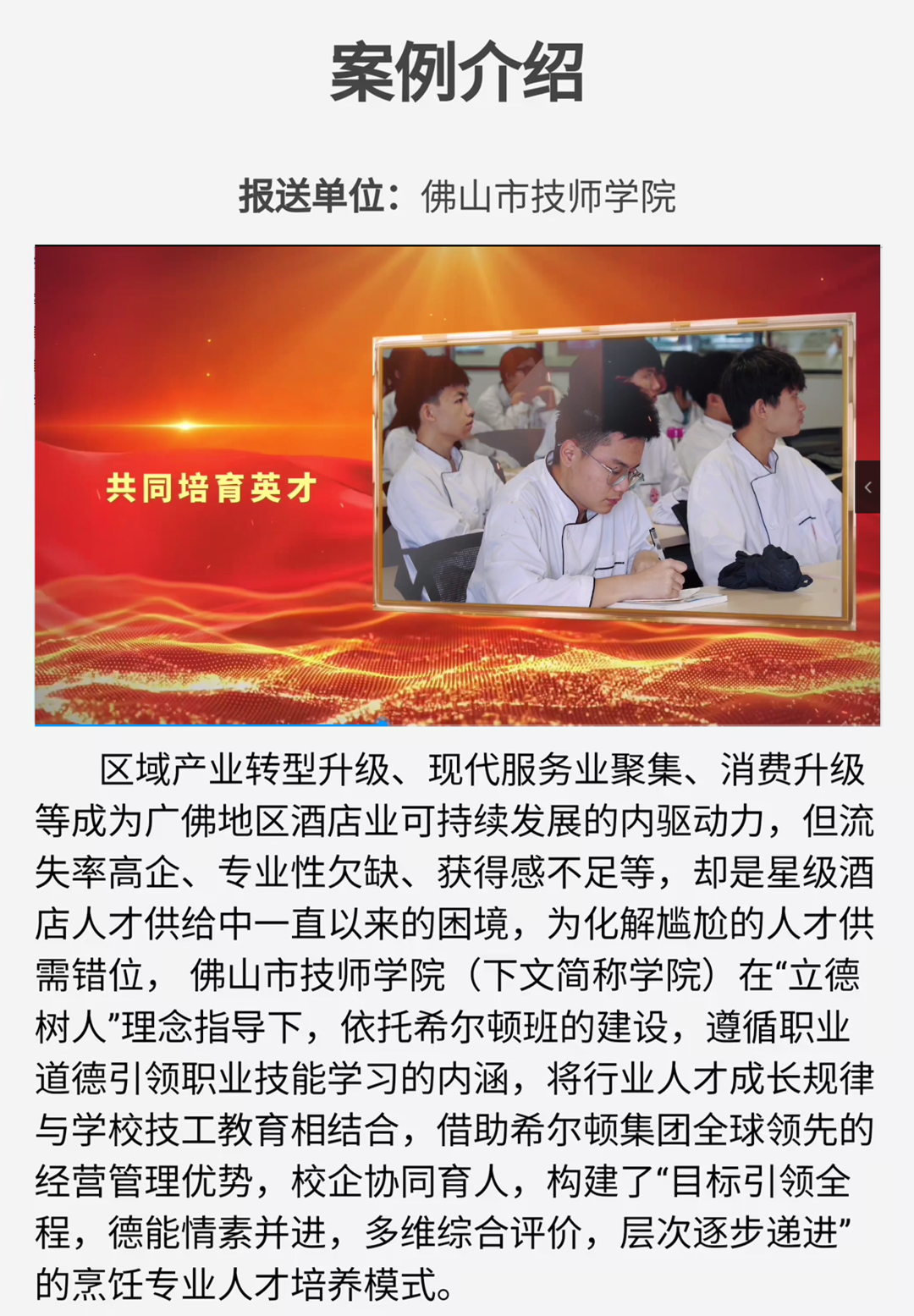 在工学一体化技能人才培养工作中,我校智能制造学院、财经商贸学院把与企业开展高技能人才培养的先进经验进行提炼总结,形成“产教融合”典型案例,并上报广东省技工院校第一届“工学一体化技能人才培养模式-产教融合典型案例”评选活动。在被评为“百优案例”的三项案例中,《校企协同育人,共育星级英才——佛山市技师学院与希尔顿酒店校企合作案例》荣获一等奖,《校企共育人才精准对接,培养精密制造高技能人才》荣获三等奖。