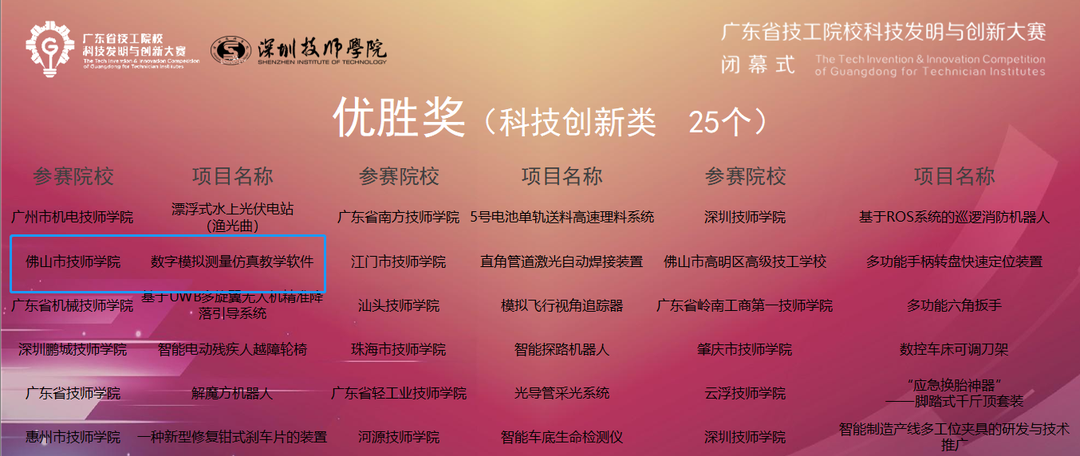 2023年4月14日,第一届广东省技工院校科技发明与创新大赛决赛在深圳圆满落幕,我校参赛师生获得文化创意类项目三等奖1项、科技创新类项目优胜奖1项。