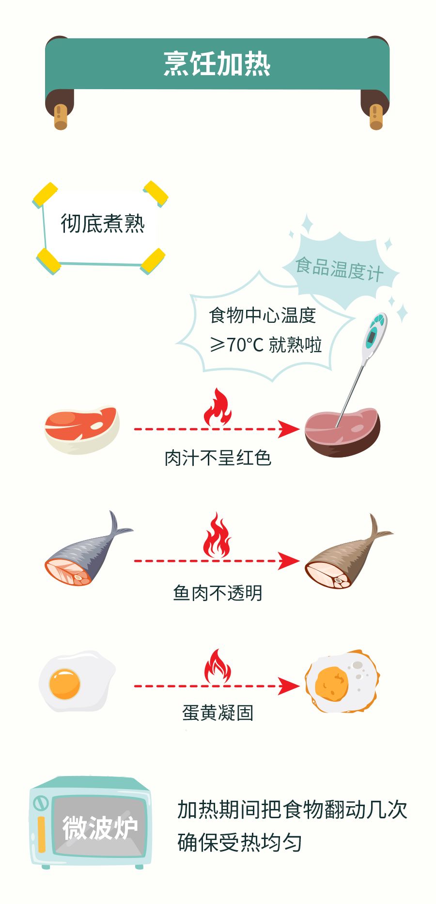 正确的烹调方法和适当的温度,可以杀死几乎所有的有害微生物,烹调食物的温度达到70℃有助于保证食用安全。因此,加工肉、禽、蛋、海产品等食物时要煮熟、烧透,尤其是烤肉、肉馅、大块的肉和整只鸡等。如果用小火,由于温度低,就必须延长时间,即“小火慢炖”。